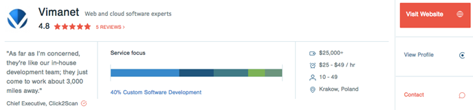 Clutch analysts conducted independent and in-depth telephone interviews with our clients to gather their ratings and reviews over our projects. The full results are showcased on Vimanet’s very own company profile.